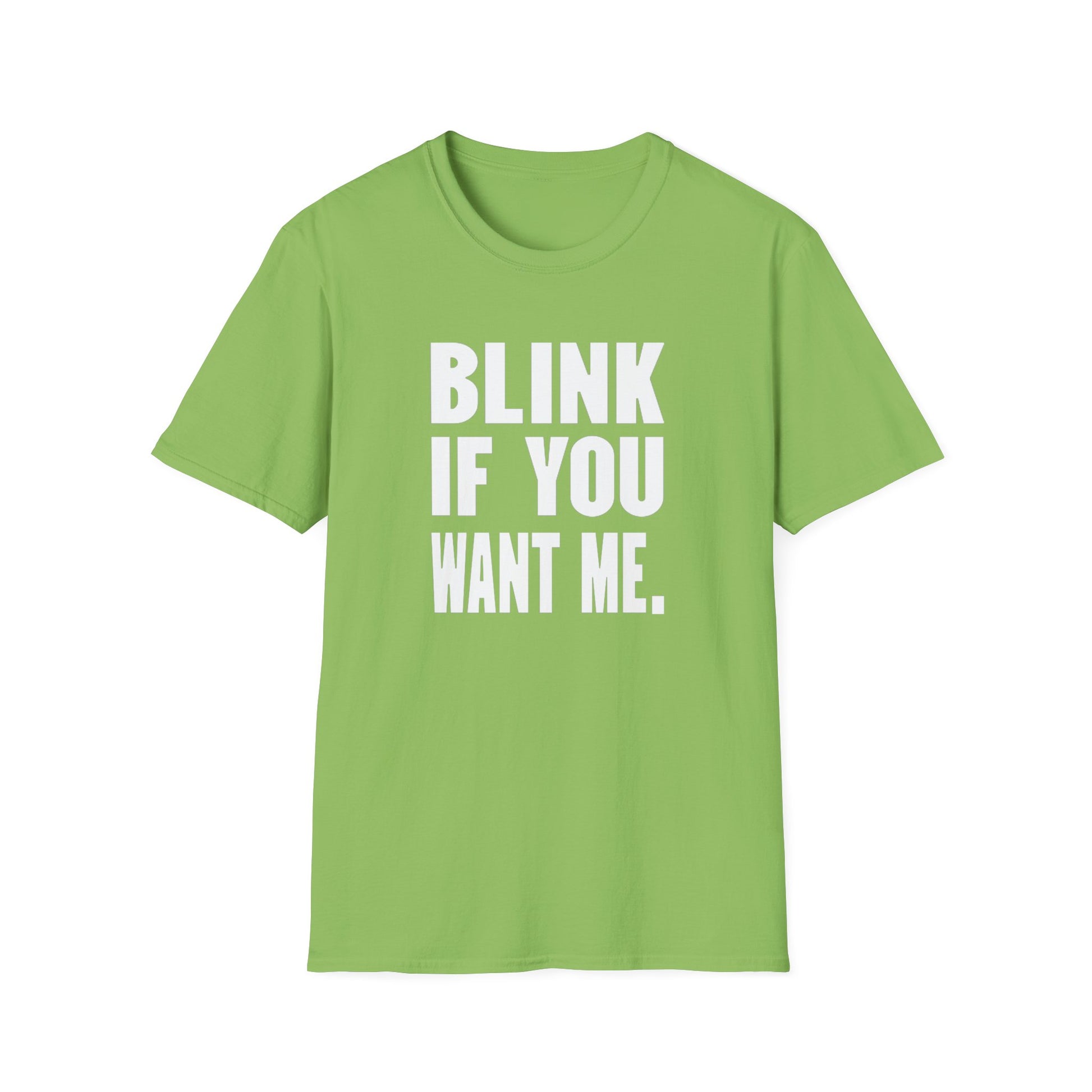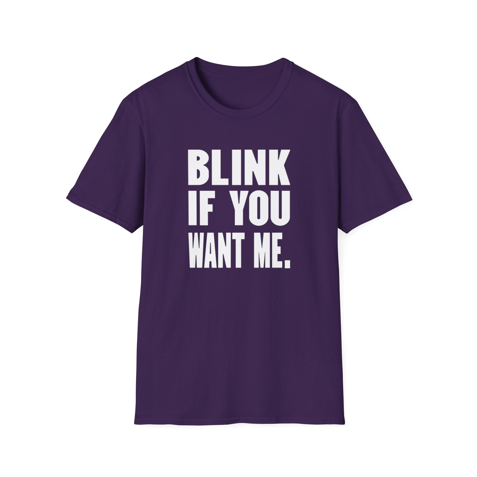 A soft and comfortable unisex T-shirt with a fun 'Blink If You Want Me' design. Perfect for casual wear and adding a playful touch to any outfit. Ideal for adults looking for a versatile and stylish top to wear all year round. Great for Valentine's Day, anniversaries, or any day you want to make a statement.